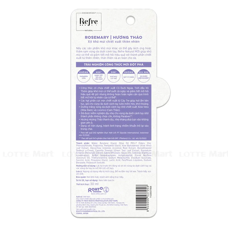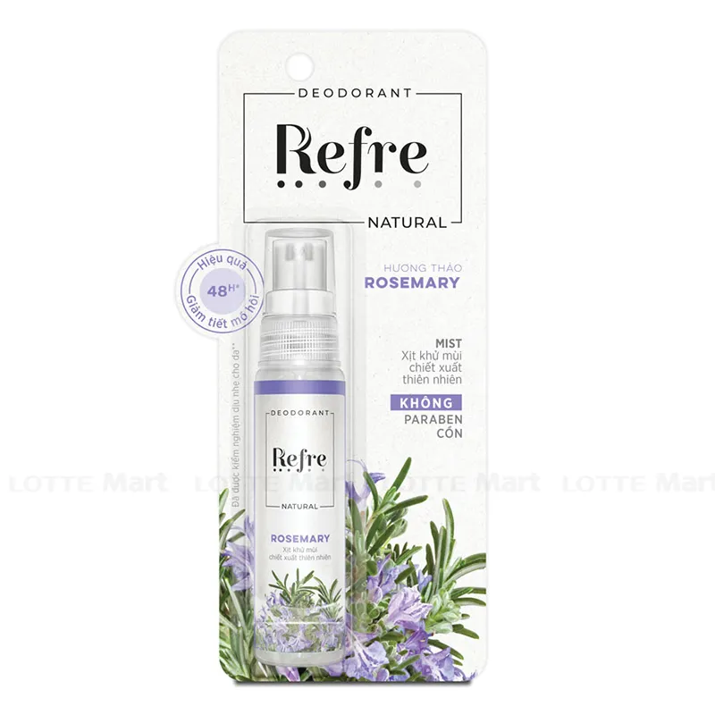 Xịt Khử Mùi Refre Natural Refre Chiết Xuất Hương Thảo 30ml với chiết xuất từ hương thảo giúp khử mùi và ngăn tiết mồ hồi vùng da dưới cánh tay hiệu quả, nha đam làm dịu vùng da bị tổn thương do dùng nhíp và dao cạo, ngăn ngừa thâm sạm, đồng thời cam thảo dưỡng trắng da.