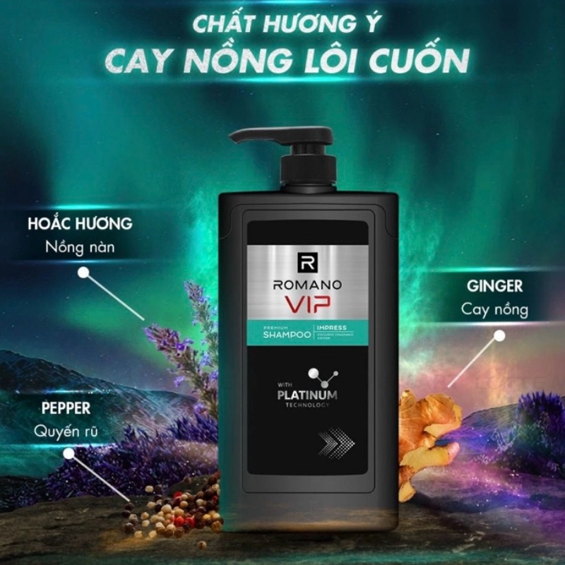 - Dầu Gội Nước Hoa Romano VIP Impress Chai 650G được chế tác theo phong cách Ý với sự kết hợp lôi cuốn từ nốt hương cay, ấm của Ginger và Black Pepper hòa cùng nốt hương nồng nàn của Patchouli.