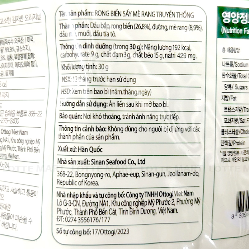 Thành phần: Dầu bắp, rong biển, đường, mè rang, dầu mè, muối, dầu tía tô…