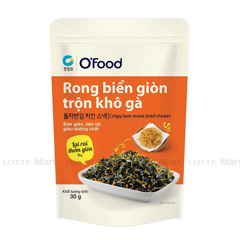 Rong Biển Trộn Khô Gà O'food Gói 30g với rong biển được nướng giòn với nhiệt độ thích hợp, sau đó trộn cùng dầu mè, vừng và một số loại gia vị mang đến hương vị mằn mặn vừa ăn, xen lẫn vài sợi khô gà dai thơm càng làm cho món snack trở nên thu hút. Hứa hẹn sẽ là món ăn vặt lí tưởng cho các buổi xem phim, vui chơi sinh hoạt,...