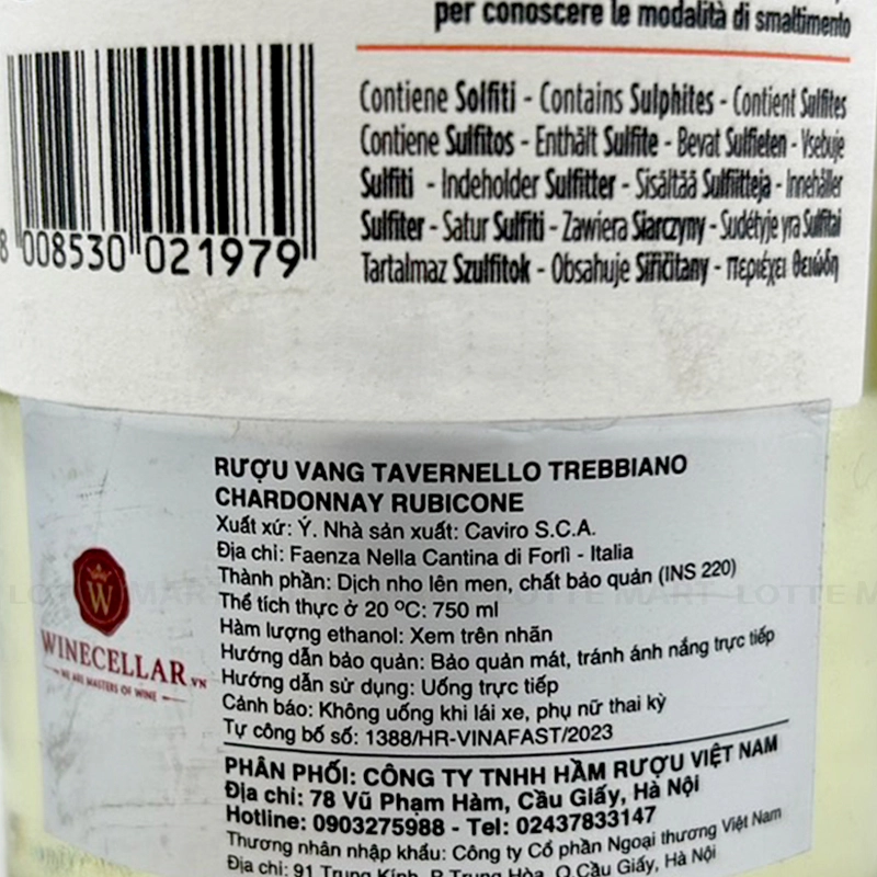 Rượu Vang Trắng Tavernello Trebbiano Chardonnay Rubicone IGT 12% ABV Chai 750ml