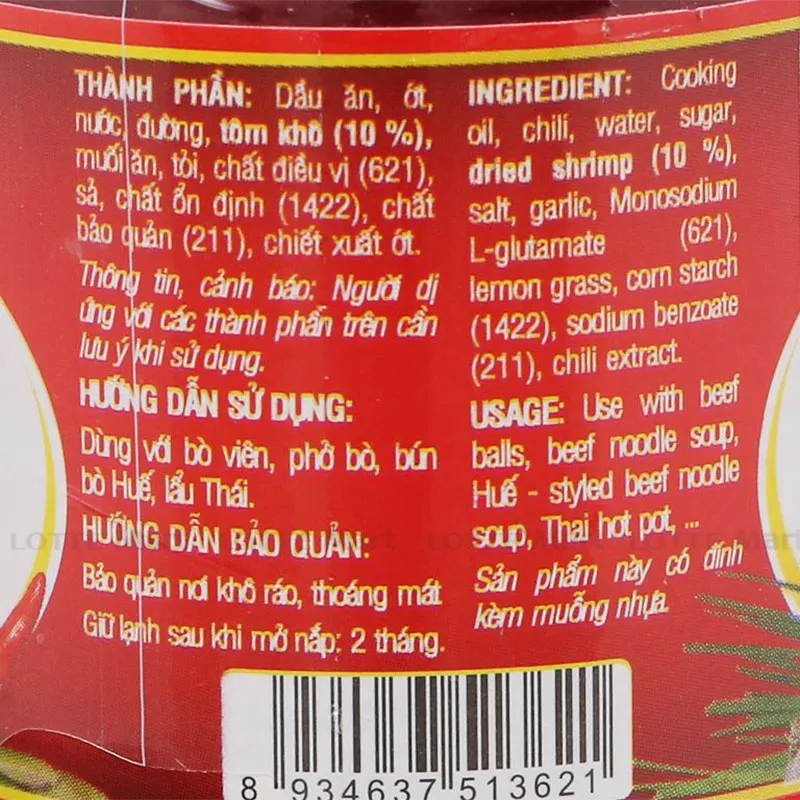 Sa Tế Tôm Cholimex được làm từ đậu nành chọn lọc, không chưa chất bảo quản, mang đến vị thơm ngon, hấp dẫn cho các bữa ăn trong gia đình, đảm bảo an toàn cho sức khỏe. Thành phần: Dầu ăn, Ớt, Đường, Tôm khô, Tỏi, Sả, Muối ăn. Công dụng: Làm gia vị nêm nếm cho các món phở, lẩu Thái, bún bò Huế. Bảo quản ở nơi khô thoáng, tránh ánh nắng trực tiếp.