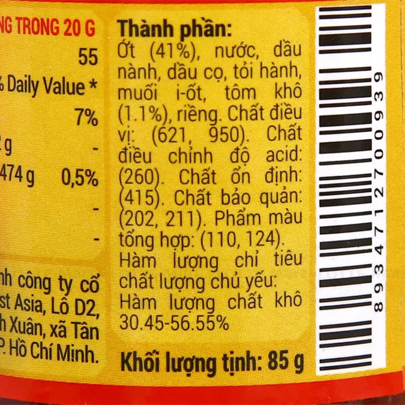 • Tôm khô, ớt, dầu ăn, tỏi, muối, hành, riềng, chất điều vị, chất bảo quản, chất tạo màu.
