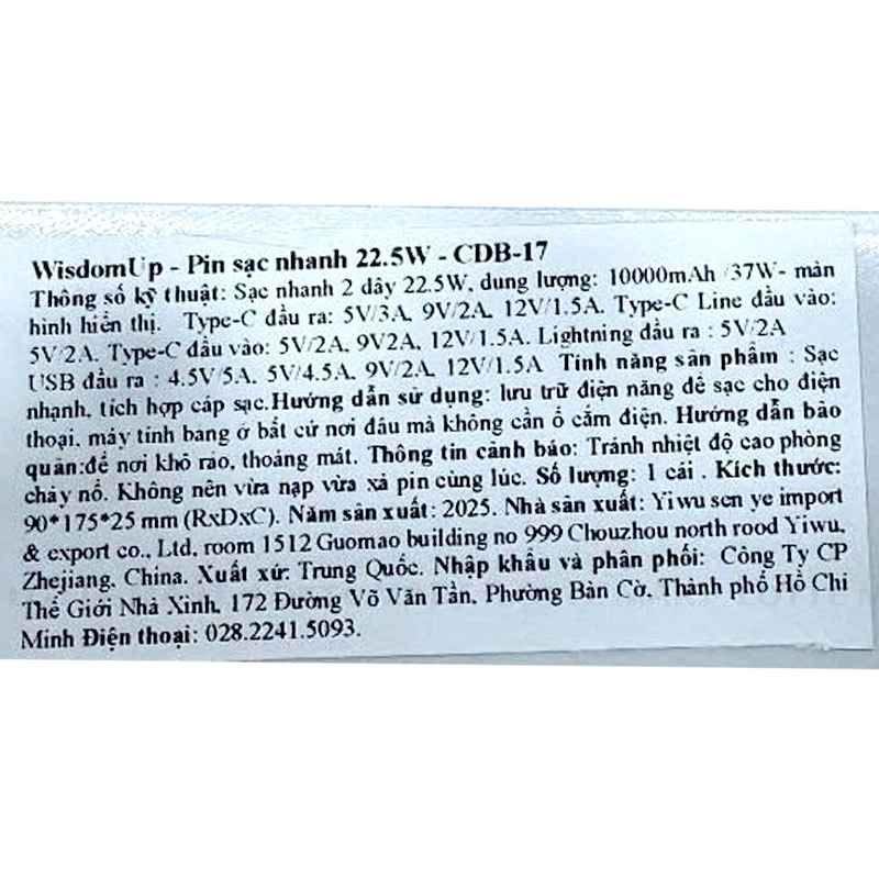 - Pin Sạc Nhanh WisdomUp 22.5W CDB-17 là giải pháp năng lượng di động tiện lợi, thiết kế tích hợp sẵn 2 dây sạc (Lightning và Type-C), giúp bạn sử dụng ngay mà không cần mang theo cáp rời.