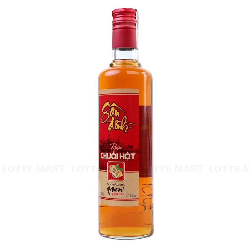 Rượu Chuối Hột Sân Đình 29.5% ABV Chai 400ml có nồng độ cồn là 29.5%, được tuyển chọn từ trái chuối hột rừng chín vàng vùng rừng núi Tây Bắc. Sau khi được thu hoạch, chuối hột rừng được ngâm ủ trong rượu Sân Đình truyền thống cho đến khi có màu nâu ánh đỏ, sánh mịn, thơm nồng, đặc trưng của rượu chuối.Chuối hột rừng mọc tự nhiên tại các vùng miền núi nước ta như dãy Trường Sơn, Tây Bắc…