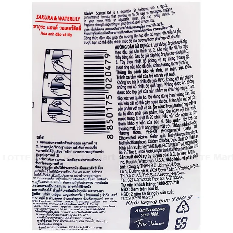 - Sáp Thơm Glade Hương Hoa Anh Đào & Lily là một sản phẩm đến từ thương hiệu Glade - thương hiệu chuyên sản xuất và phân phối các sản phẩm khử mùi nhà cửa nổi bật như sáp thơm, xịt phòng. Sản phẩm mang đến không gian ấm cúng, dễ chịu trong gia đình bạn.