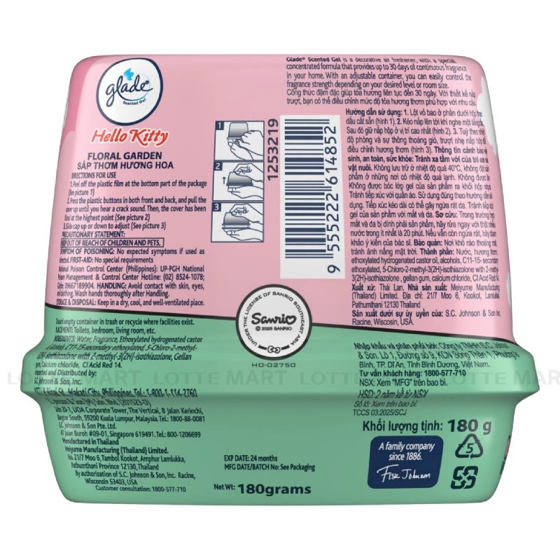 Sáp Thơm Glade Hello Kitty Hương Hoa với thiết kế đáng yêu in hình Hello Kitty trên bao bì không chỉ mang lại sự tiện ích mà còn tạo điểm nhấn trang trí ngọt ngào, phù hợp cho nhiều không gian khác nhau.