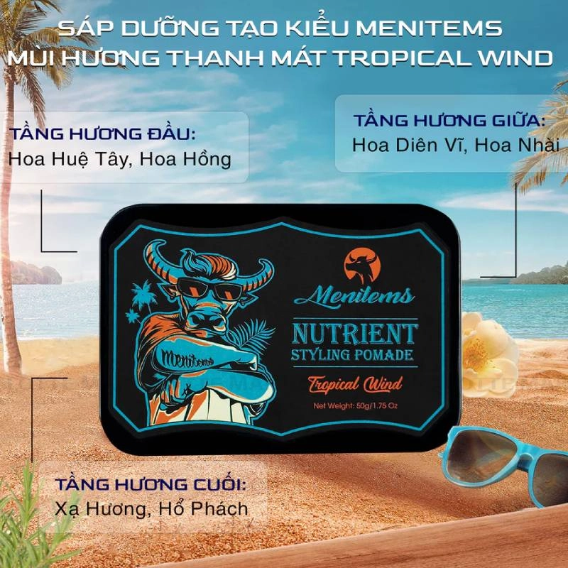 - Sáp Vuốt Tóc Menitems Pomade Tropical Wind giúp giữ nếp, ổn định form tóc từ 10 đến 12 tiếng cùng khả năng tạo kiểu lại sau khi đội mũ bảo hiểm rất tốt, có thể lùa tay tạo kiểu lại mà không bị rít hay dứt rụng tóc.