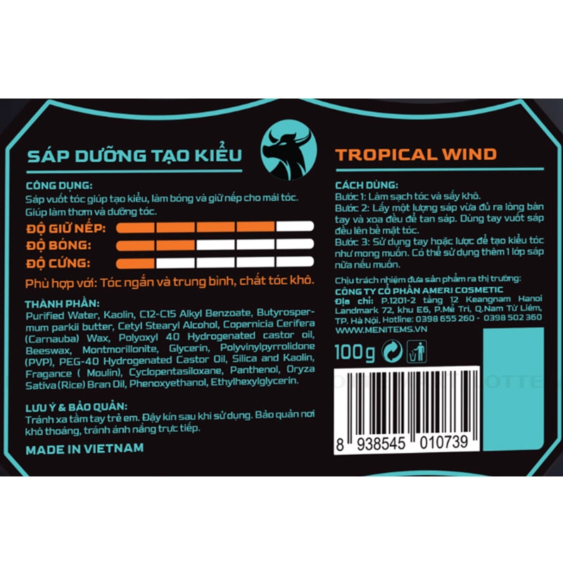 Sáp Vuốt Tóc Menitems Pomade Tropical Wind giúp tạo kiểu và giữ nếp hiệu quả.