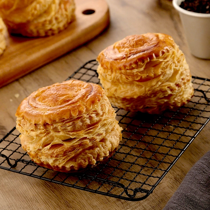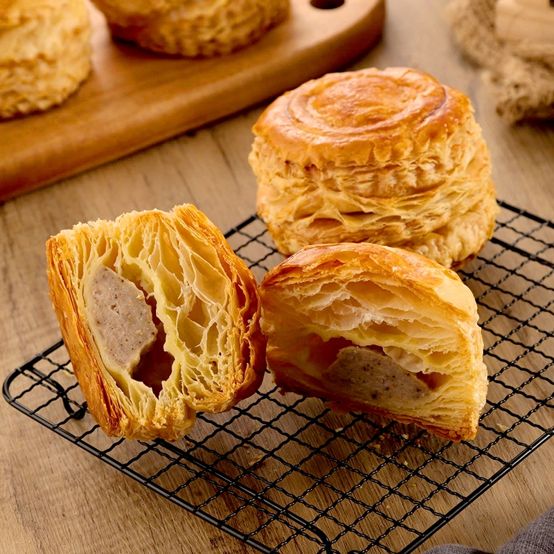 - Lớp vỏ ngoài được làm từ bột mì chất lượng cao, nướng vàng giòn rụm, tạo nên sự giòn tan thú vị ngay khi cắn vào, giữ cho nhân bên trong luôn ẩm mượt.