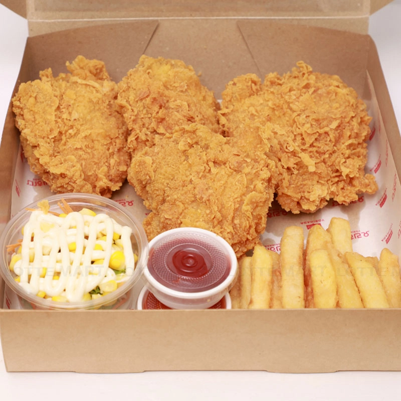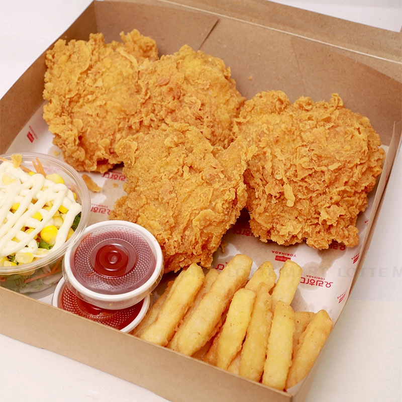 Thành phần: Má đùi gà chiên, tương cà, tương ớt, khoai tây chiên, salad,bắp mỹ, xà lách lolo, xốt mayo.