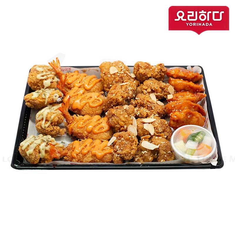 Gà Rán Hàn Quốc 1 là combo món ăn đa dạng gồm mandu sốt cay ngọt, tôm chiên sốt mayo cay, gà karaage sốt mật ong và gà karaage sốt mù tạt.