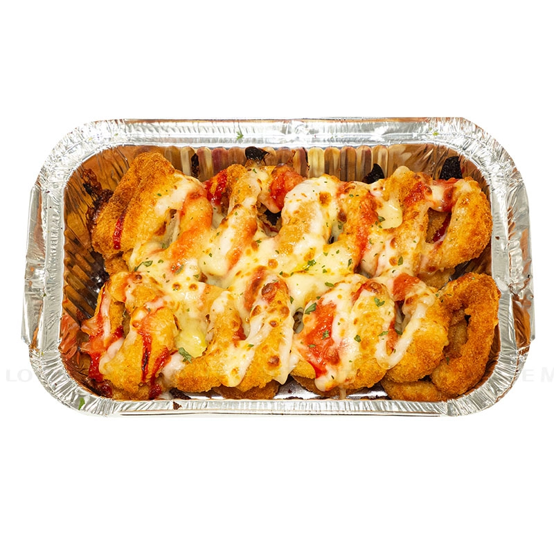 Sản phẩm được đặt trong khay giấy bạc, đã sẵn sàng để hâm nóng hoặc nướng sơ lại.