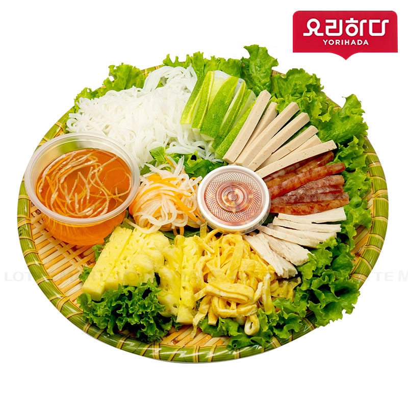 Món ăn được kết hợp từ nhiều nguyên liệu khác nhau như dưa chuột, chả lụa, lạp xưởng, trứng chiên và đồ chua, có đi kèm nước mắm chua ngọt thơm ngon.