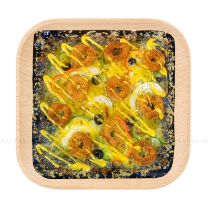 Thành phần: Bột mì, bột than tre, đường, dầu, men khô, muối, xốt trứng muối, whipping cream, phô mai, mực khoanh tẩm bột xù, hành tây, ớt chuông, olives đen, lá mùi tây khô.