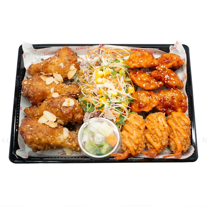 - Mandu sốt cay ngọt, tôm tem sốt spy-mayo, cánh tỏi gà rán sốt mật ong, salad, rau củ muối chua