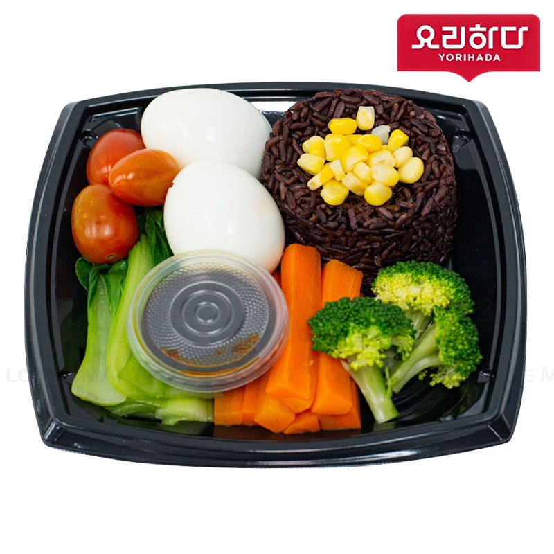 Thành phần: Cà chua bi, cải thìa, cà rốt, bông cải xanh, trứng luộc và cơm gạo lức, kho quẹt.