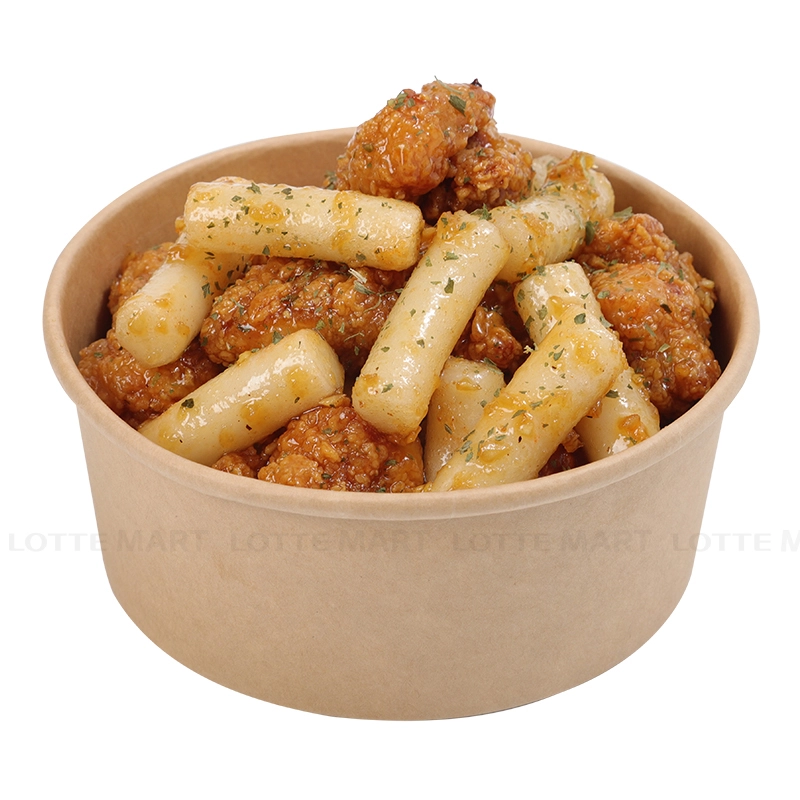 Thành phần: Bánh gạo chiên, gà Dakgangjeong, mè rang, sốt tương tỏi, lá thơm mùi tây.