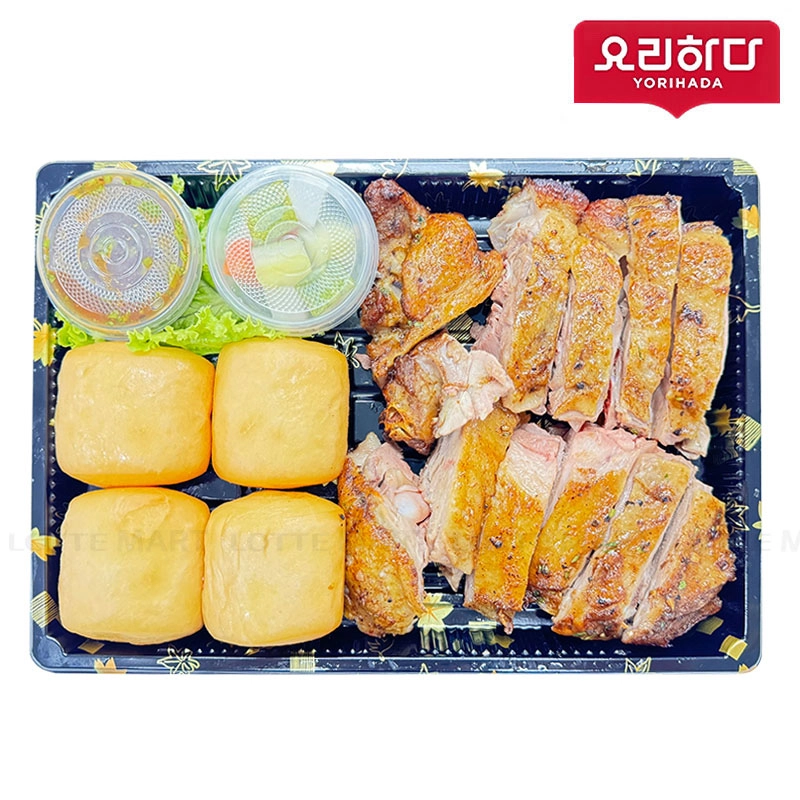 Thành phần: Vịt nướng và sốt tiêu đen, bánh bao và đồ chua.