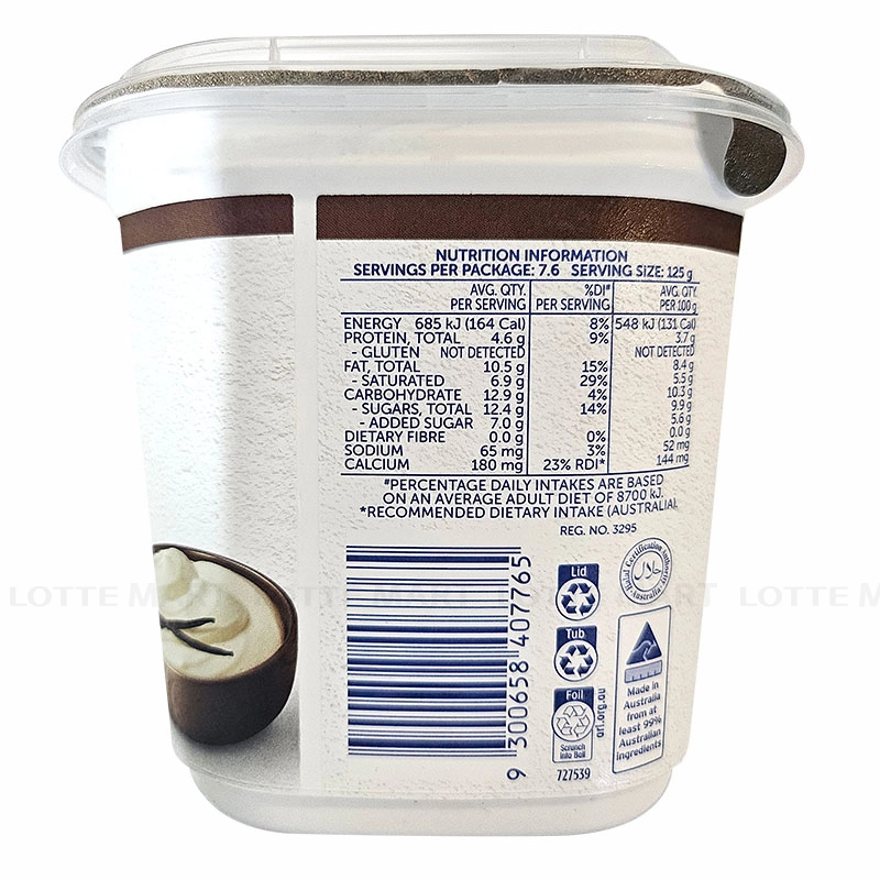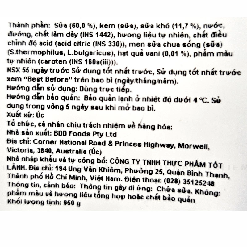 - Sữa (60%), kem (sữa), sữa khô (11.7%), nước, đường, chất làm dày (INS 1442), hương liệu tự nhiên, chất điều chỉnh độ acid (acid citric (INS 330)), men sữa chua sống (sữa) (S.thermophilus, L. bulgaricus), hạt quả vani (0.01%), phẩm màu tự nhiên (caroten (INS 160a(iii))).
