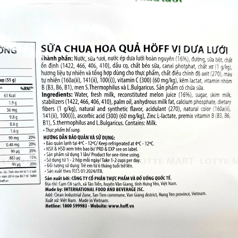 - Sữa Chua Ăn Hoff Vị Dưa Lưới là sự hòa quyện giữa sữa tươi lên men và nước ép dưa lưới, mang đến hương vị thanh mát, dễ ăn và giàu dinh dưỡng.