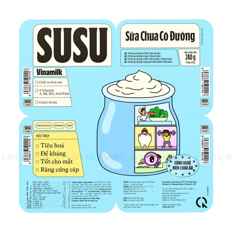 - Với thiết kế hộp nhỏ gọn, tiện lợi khi mang theo, sữa chua SuSu có đường là lựa chọn phù hợp để bổ sung vào khẩu phần ăn lành mạnh mỗi ngày.