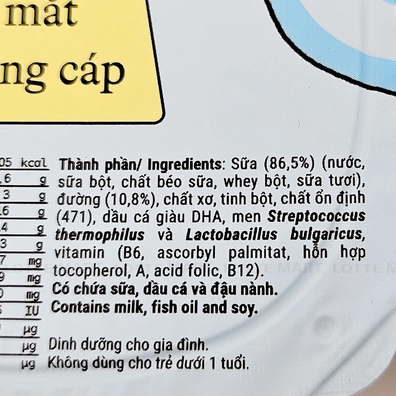 - Sữa (86.5%) (nước, sữa bột, chất béo sữa, whey bột, sữa tươi), đường (10.8%), chất xơ, tinh bột, chất ổn định (471), dầu cá giàu DHA, men Streptococcus thermophilus và Lactobacillus bulgaricus, vitamin (B6, ascorbyl palmitat, hỗn hợp tocopherol, A, acid folic, B12).