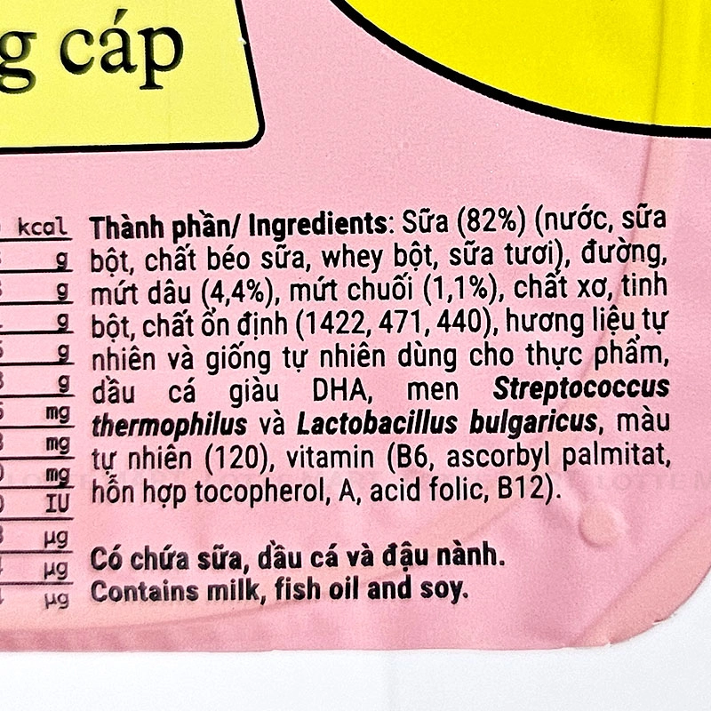 - Sữa (82%) (nước, sữa bột, chất béo sữa, whey bột, sữa tươi), đường, mứt dâu (4.4%), mứt chuối (1.1%), chất xơ, tinh bột, chất ổn định (1422, 471, 440), hương liệu tự nhiên và giống tự nhiên dùng cho thực phẩm, dầu cá giàu DHA, men Streptococcus thermophilus và Lactobacillus bulgaricus, màu tự nhiên (120), vitamin (B6, ascorbyl palmitat, hỗn hợp tocopherol, A, acid folic, B12).