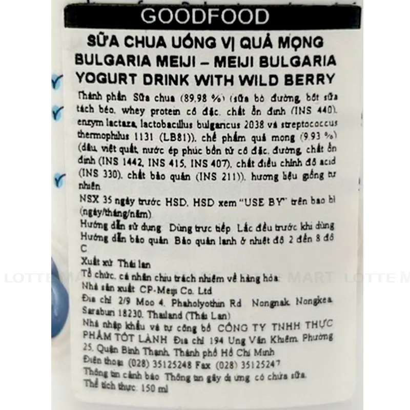 - Sản phẩm chế biến từ nguồn sữa tươi chất lượng cao với quy trình kiểm soát đầu vào nghiêm ngặt theo tiêu chuẩn Meiji Nhật Bản, tạo nên dòng sữa chua uống có kết cấu mềm mịn, trộn quả mọng thật, chua chua, đậm đà, dễ uống phù hợp khẩu vị của đa số người tiêu dùng sẽ giúp bổ sung lợi khuẩn LB81 giúp cân bằng cho hệ tiêu hóa.