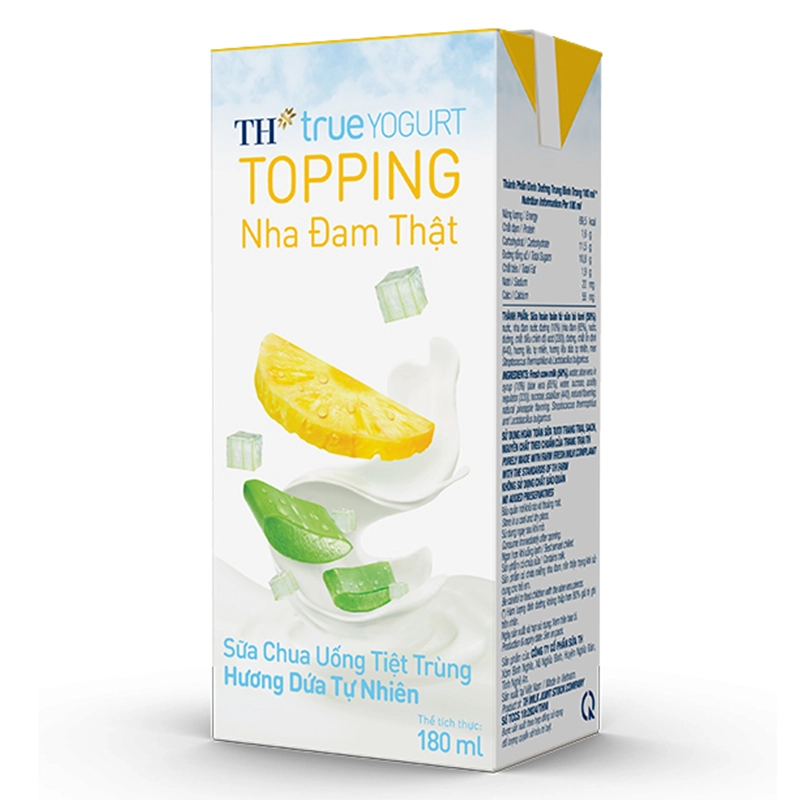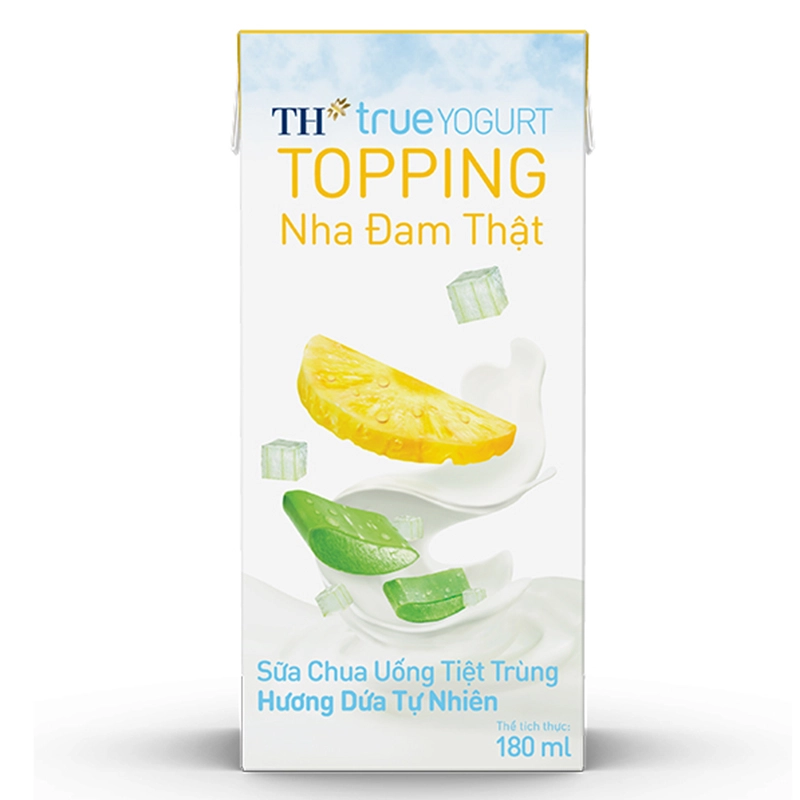 - Sữa Chua Uống Tiệt Trùng TH Topping Hương Dứa chua thanh, ngọt dịu, được lên men tự nhiên từ sữa tươi trang trại, sạch, nguyên chất theo chuẩn của trang trại TH kết hợp cùng miếng nha đam mát lành mang đến trải nghiệm nhai thú vị, cuốn hút.
