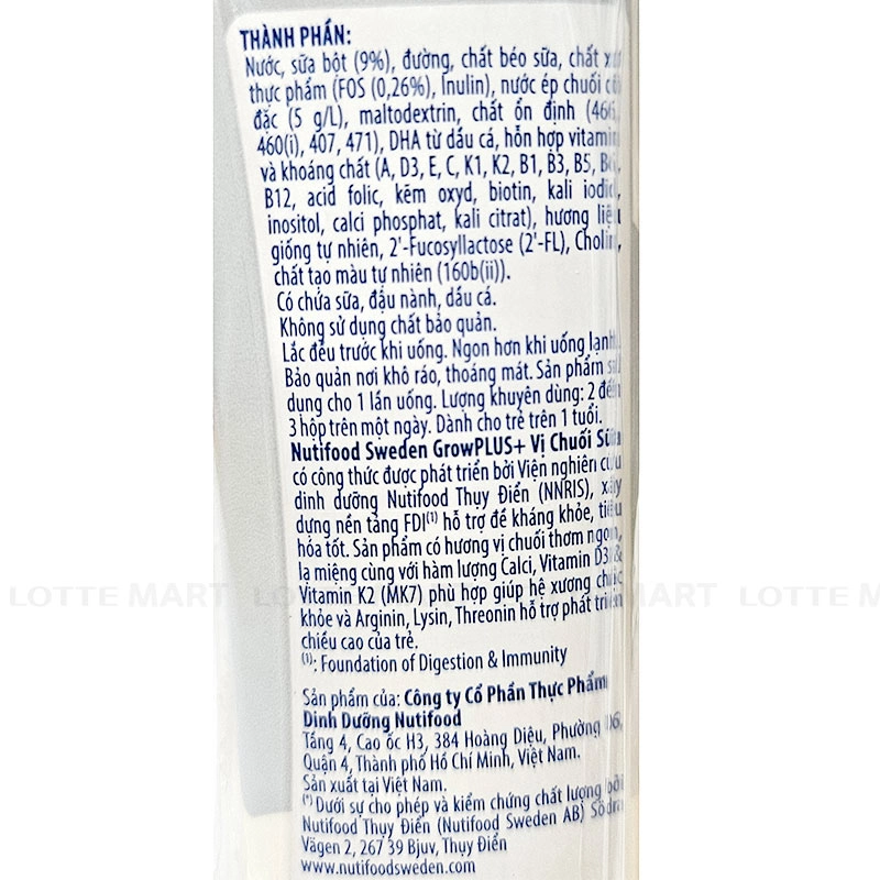 - Nước, sữa bột (9%), đường, chất béo sữa, chất xơ thực phẩm (FOS (0.26%), Inulin), maltodextrin, nước ép chuối cô đặc (5g/L), chất ổn định (466, 460(i), 407, 471), DHA từ dầu cá, hỗn hợp vitamin và khoáng chất (A, D3, E, C, K1, K2, B1, B3, B5, B6, B12, acid folic, kẽm oxyd, biotin, kali iodid, inositol, calci phosphat, kali citrate), hương liệu giống tự nhiên, hương liệu tự nhiên, 2’-Fucosyllactose (2’-FL), Cholin, chất tạo màu tự nhiên (160b(ii)).