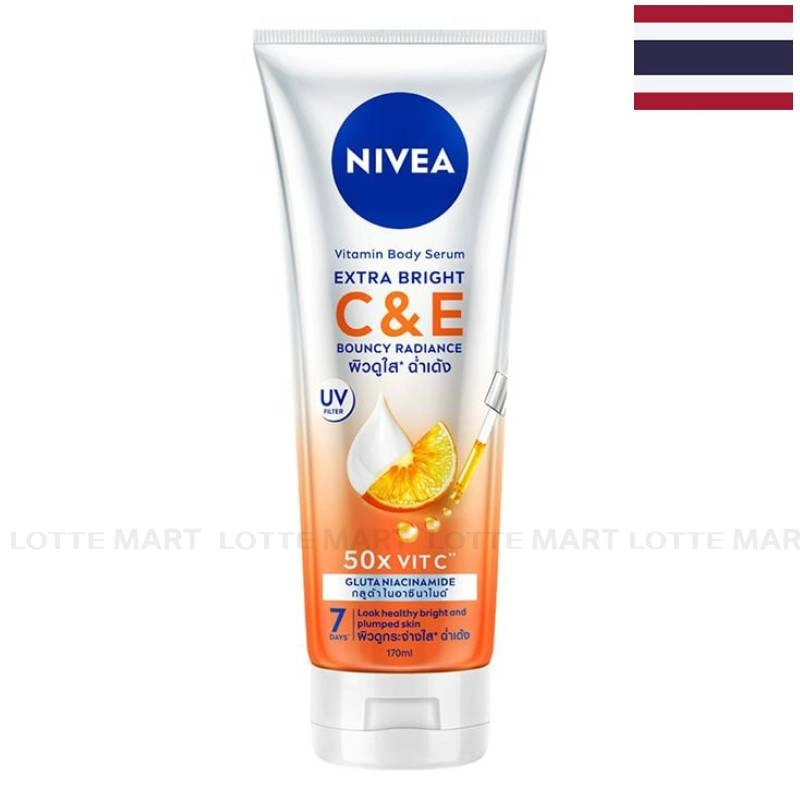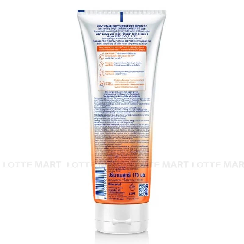 Sữa Dưỡng Thể Nivea Dưỡng Sáng Da Vitamin C & E Extra White Tuýp 180ml với công thức tăng cường hàm lượng vitamin cô đặc C, E, A giúp nuôi dưỡng làn da sáng mịn, đều màu các vết thâm sạm, tăng cường độ đàn hồi và săn chắc da.