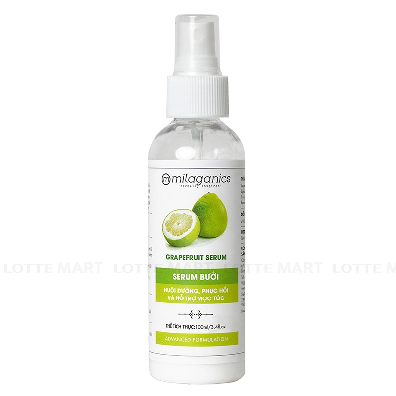 - Serum Bưởi Milaganics Chai 100ml được chiết xuất từ tinh dầu bưởi giúp kích thích nang lông hoạt động giúp tóc mọc dày, dài và nhanh hơn, nuôi dưỡng mái tóc chắc khỏe, giảm gãy rụng.