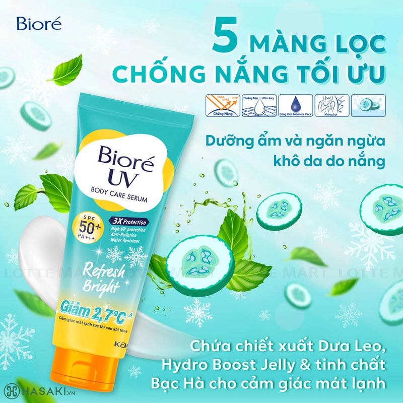 - Serum Chống Nắng Bioré Dưỡng Thể Sáng Mịn Mát Lạnh giúp chống nắng toàn thân tối ưu, bảo vệ da trước tia UV – SPF50+ PA +++ ngăn xỉn màu, đốm đen và da không đều màu do tác động của tia UVA và UVB.