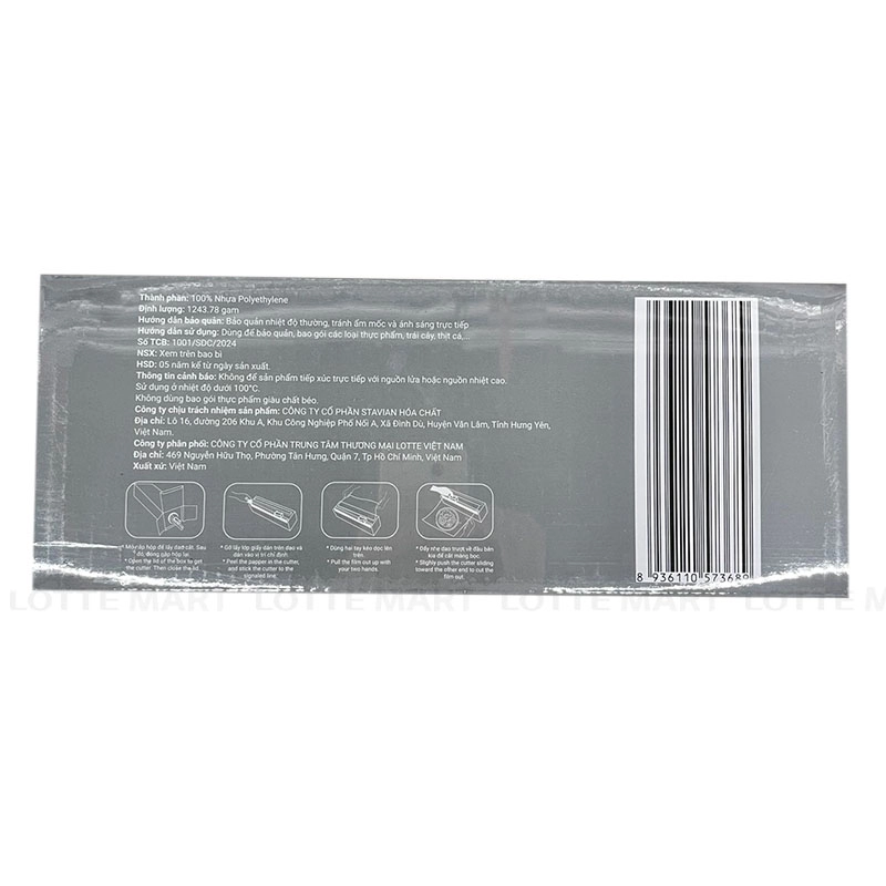 Màng bọc có độ dẻo dai cao, đảm bảo bọc chặt thực phẩm, ngăn ngừa vi khuẩn và bụi bẩn xâm nhập, đồng thời dễ dàng cắt và sử dụng, lý tưởng cho việc bọc thực phẩm trong tủ lạnh, hộp cơm hay bàn ăn.