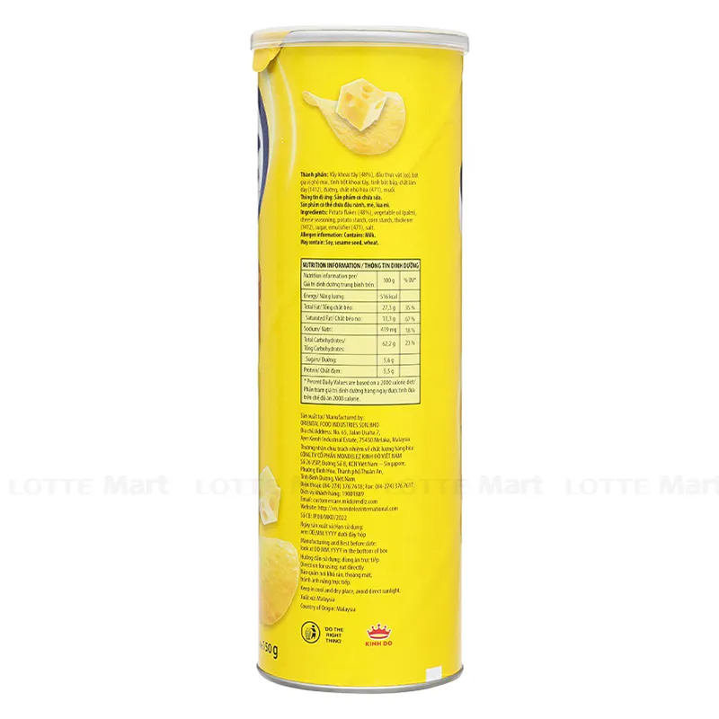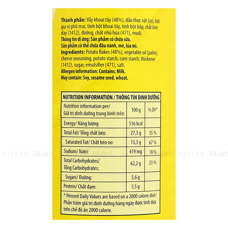 - Thành phần: Khoai tây, tinh bột khoai tây, dầu cọ tinh luyện, glucose, muối, đường, chất điều vị, bột gia vị hương phô mai