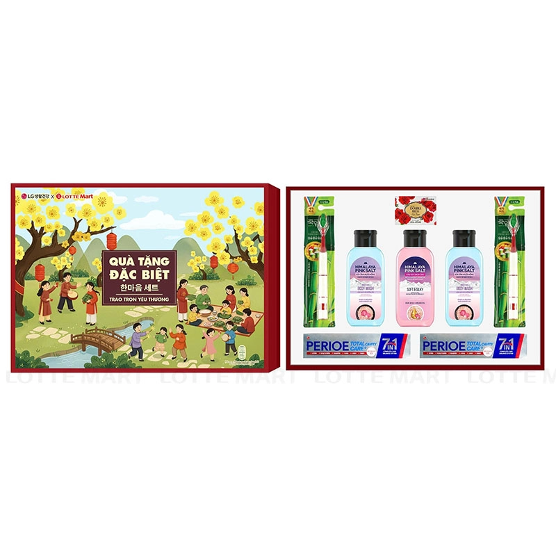 Bộ quà tặng bao gồm 2 Tuýp Kem Đánh Răng Perioe Ngừa Sâu Răng 180G, 1 Bàn Chải Đánh Răng Bamboo Chăm Sóc Nướu, 1 Bàn Chải Đánh Răng Bamboo Chăm Sóc Răng Ê Buốt, 2 Chai Sữa Tắm Himalaya Muối Hồng 200G, 1 Chai Dầu Gội Himalaya Muối Hồng 200G và 1 Xà Bông Cục Double Rich Hoa Hồng 90G.