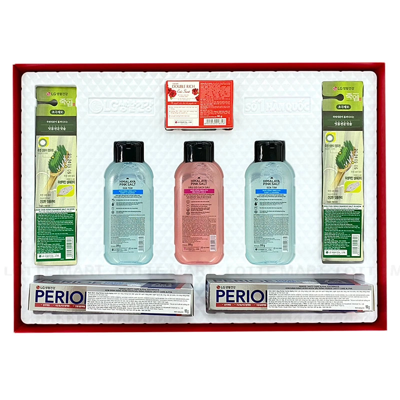Bộ quà tặng bao gồm 2 Tuýp Kem Đánh Răng Perioe Ngừa Sâu Răng 180G, 1 Bàn Chải Đánh Răng Bamboo Chăm Sóc Nướu, 1 Bàn Chải Đánh Răng Bamboo Chăm Sóc Răng Ê Buốt, 2 Chai Sữa Tắm Himalaya Muối Hồng 200G, 1 Chai Dầu Gội Himalaya Muối Hồng 200G và 1 Xà Bông Cục Double Rich Hoa Hồng 90G