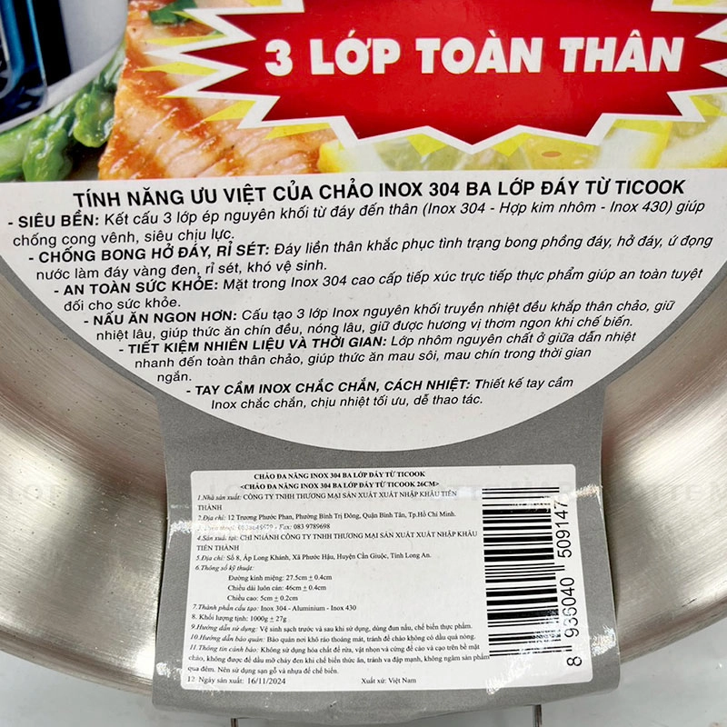 - Chảo Đa Năng Ticook Inox 304 3 Lớp Đáy Từ là sản phẩm thiết yếu cho việc nấu nướng trong mỗi gia đình. Sản phẩm có kết cấu 3 lớp ép nguyên khối từ đáy đến thân gồm Inox 304 - Hợp kim nhôm, Inox 430 giúp chống cong vênh, siêu chịu lực.
