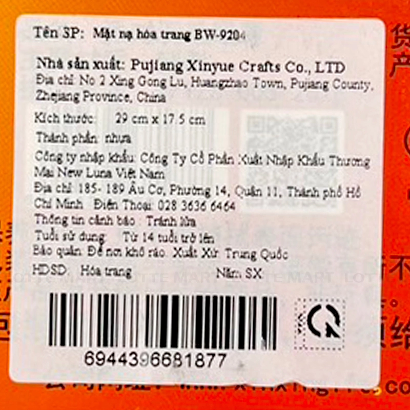 - Mặt Nạ Hóa Trang BW-9204 là phụ kiện hoàn hảo để bạn tạo nên một diện mạo độc đáo và quyến rũ trong các bữa tiệc hóa trang vào dịp Halloween. Với thiết kế tinh tế, sản phẩm này sẽ giúp bạn nổi bật và thu hút mọi ánh nhìn.