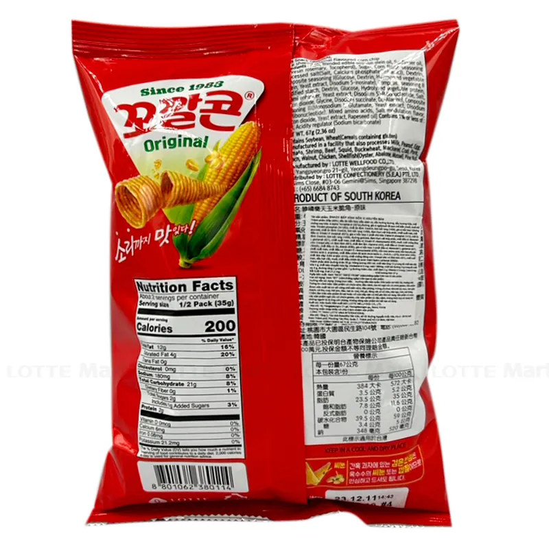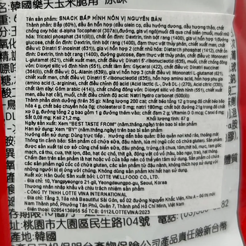- Snack Bắp Hình Nón Lotte Original Gói 67G là một món ăn nhẹ mang hương vị thơm ngon của bắp nguyên bản, kết cấu bánh giòn vè hình dáng chiếc nón vừa với ngón tay. Bánh thích hợp làm món ăn vặt làm mê mẩn biết bao thế hệ.