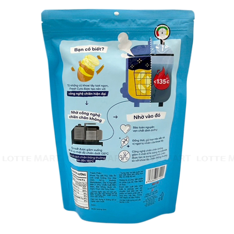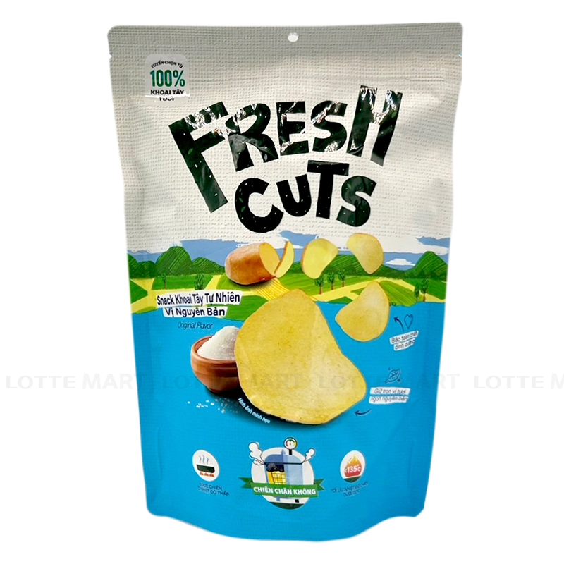 - Snack Khoai Tây Vị Tự Nhiên Fresh Cuts mang đến hương vị tự nhiên từ những lát khoai tây giòn tan. Không bị tẩm ướp quá nhiều gia vị, mỗi miếng khoai tây giữ nguyên được vị ngọt đặc trưng và độ giòn ngon, tạo cảm giác như vừa mới chế biến.