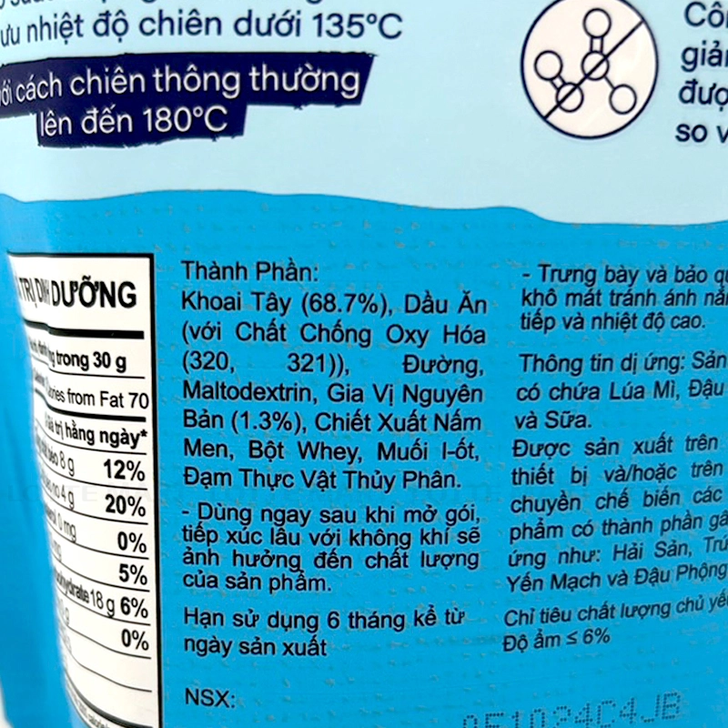 - Khoai tây (68.7%), dầu ăn (với chất chống oxy hóa (320), (321)), đường, maltodextrin,gia vị nguyên bản (1.3%), muối i-ốt, chiết xuất nấm men, bột whey, đạm thực vật thủy phân.