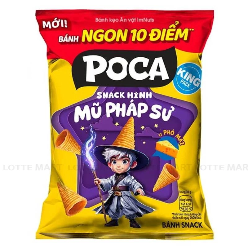 - Snack Mũ Pháp Sư Poca Vị Phô Mai là một món ăn vặt với hình dáng miếng bánh giống chiếc nón pháp sư độc đáo đến từ nhà Poca, mang đến trải nghiệm ẩm thực mới lạ cho mọi lứa tuổi.