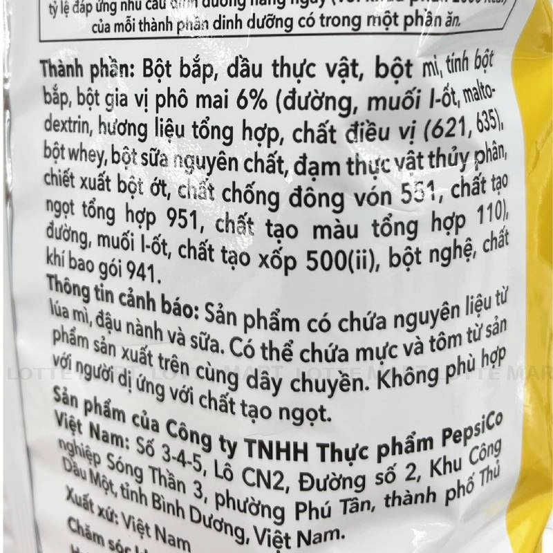 - Bột mì, tinh bột sắn, dầu thực vật, bột bắp, tinh bột, dầu thực vật, hương giống tự nhiên, màu tổng hợp (E102 và E110), muối, chất điều vị E621, shortening, đường, chất tạo xốp E500ii,...