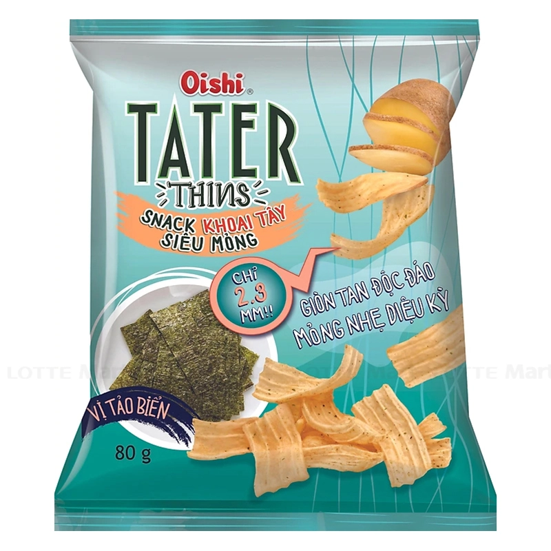 - Snack Oishi Khoai Tây Vị Tảo Biển có kích thước nhỏ vừa ăn. Độ dày của mỗi miếng bánh chỉ khoảng tầm 2.3mm, không gây ngán khi dùng, trên mặt bánh còn được kết hợp thêm một ít tảo biển tạo vị thơm khi vừa xé bao, không những thỏa mãn cơn thèm khoai tây mà còn mang đến hương vị đầy thú vị.