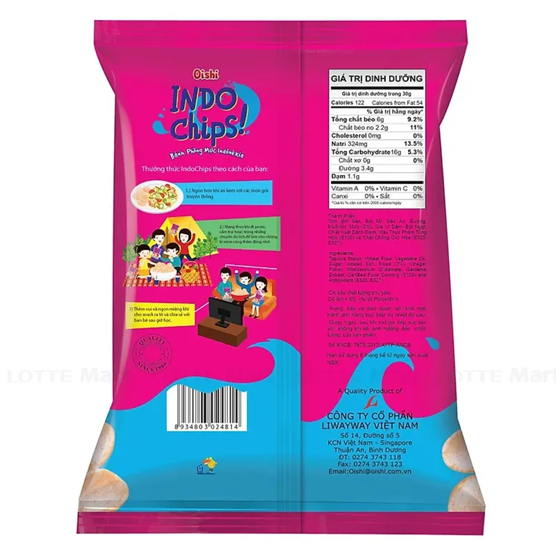 Snack Oishi Phồng Mực Indochips Gói 110g được làm từ nguyên liệu từ nhiên như bột mì, bột bắp, tinh bột sắn... Những miếng bánh giòn rụm, được tẩm hương vị thơm ngon, đậm đà đầy hấp dẫn. Bánh phồng mực Indonesia Indo Chips có dạng miếng nhỏ vừa ăn, hình dáng ngộ nghĩnh, đẹp mắt.Bên cạnh đó, sản phẩm chứa ít chất béo, phù hợp cho mọi đối tượng sử dụng.