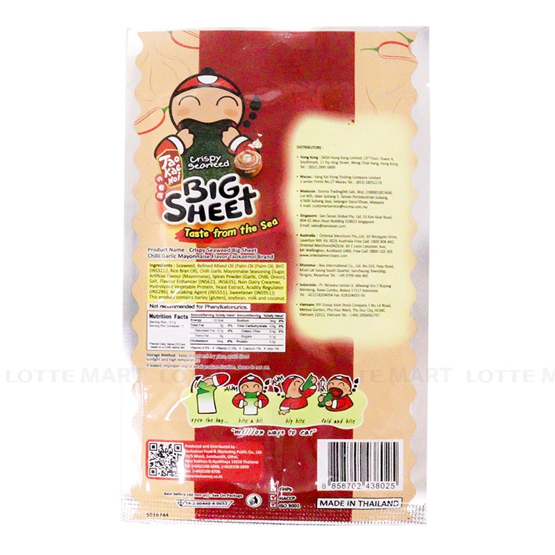 Snack Rong Biển Taokaenoi Big Sheet Vị Mayo Tỏi Ớt là sự kết hợp mới lạ giữa vị rong biển giòn tan với gia vị sốt Mayo tỏi ớt, mang lại hương vị đậm đà, cay nhẹ, béo ngậy, rất kích thích vị giác.