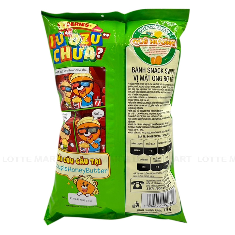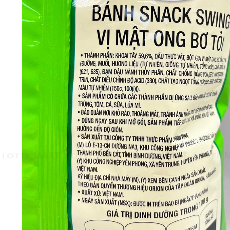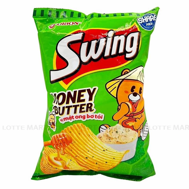 - Snack Swing Vị Mật Ong Bơ Tỏi là sản phẩm bánh snack mang một hương vị mới lạ và đầy tính sáng tạo, độc đáo của Orion và là sản phẩm snack bơ mật ong đầu tiên được sản xuất tại Việt Nam.