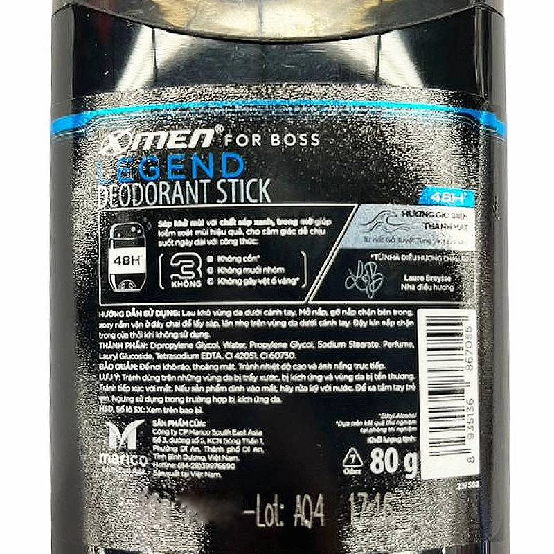 - Sáp Ngăn Mùi X-Men For Boss Legend Xanh là giải pháp lý tưởng giúp bạn tự tin suốt cả ngày dài nhờ chứa công thức không chỉ ngăn chặn mùi cơ thể mà còn mang lại cảm giác tươi mới và khô thoáng.